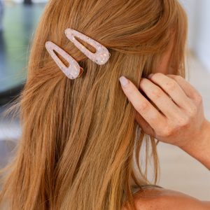 The 2 Pack Teardrop Hair Clip in Pink Shell is a lightweight teardrop alligator clip with beautiful pink shell acetate details.